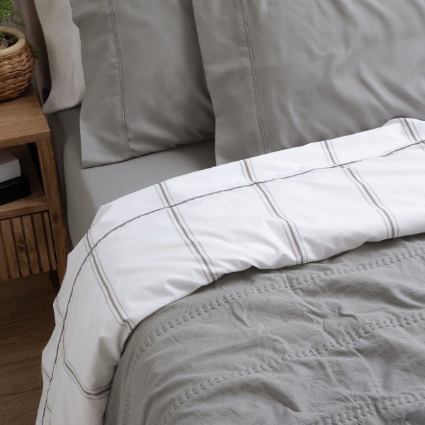 Juego de sábanas estampadas con diseño a rayas y vivo a tono.